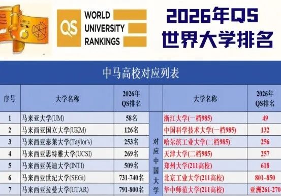 从国际排名来看,马来西亚高校的表现同样亮眼。在2026年QS世界大学排名中,多所院校展现出强劲的竞争力:
