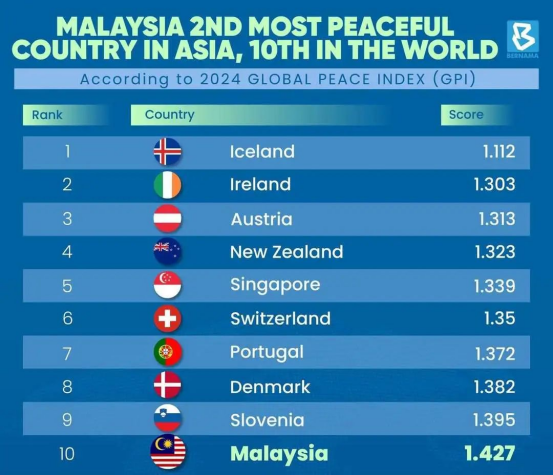 真实情况:马来西亚是亚洲地区治安状况较为良好的国家之一。长期以来,马来西亚政局稳定,社会秩序井然,在2024年《全球和平指数》排名中位列全球第10、亚太地区第3,是除新加坡外唯一进入全球前10的亚洲国家,其安全性远超美、英等传统留学热门国家。