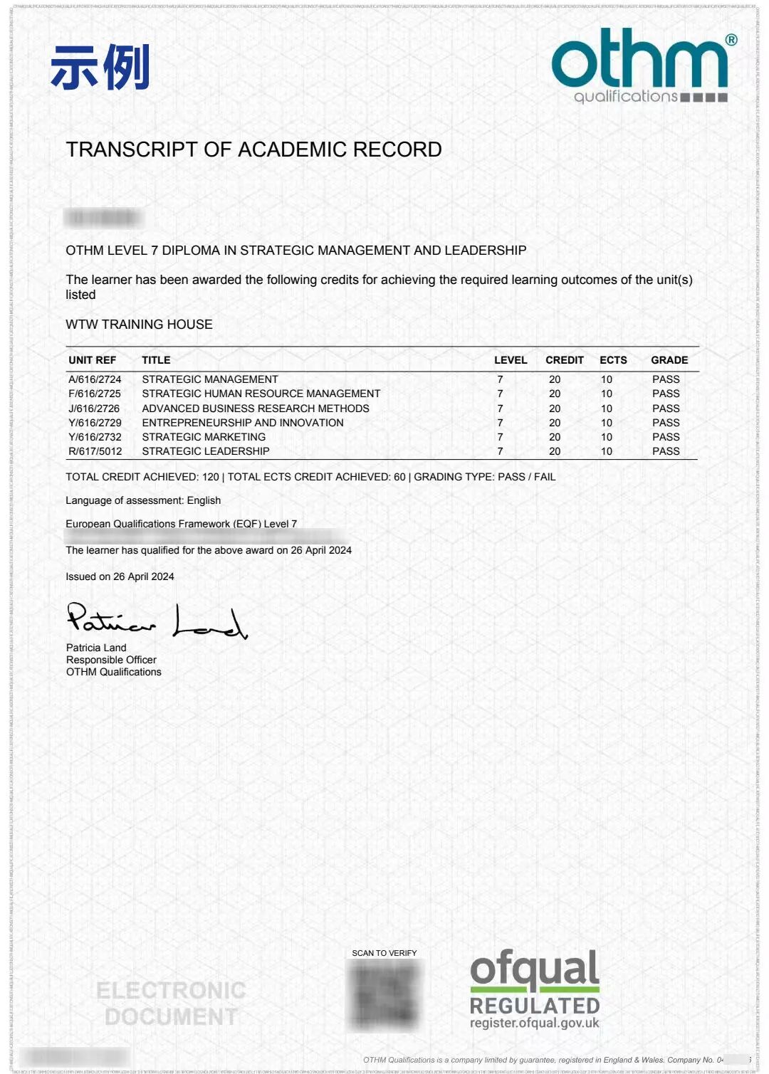 OTHM 证书的第六级(Level 6)经英国资历框架(RQF)认证,其学术层级等同于英国学士学位的最后一年,广泛受全球硕士招生院校认可。